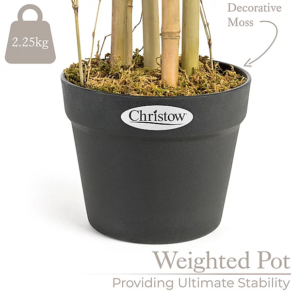 Brighten your home or garden with one these beautiful artificial bamboo plants from Christow. Pre-potted with bamboo stems and dense foliage for immediate display, they’re a low maintenance alternative to real bamboo which look every bit as beautiful and authentic. Realistic Lush Green Leaves Great care has been taken to make the leaves look as lush and realistic as possible. The leaves are made from polyester to replicate the size and thickness of real bamboo leaves. Durable Natural Bamboo Stems Whereas some artificial plants have plastic stems, our bamboo plants have natural bamboo stems for superior durability. Please be aware that the colour may vary from plant to plant. Displaying Your Plant Outdoors Although our plants are for indoor use, they look equally stylish decorating a patio or decking. If you’re displaying your plant outdoors, we recommend treating it with a UV-protective spray. Pre-Potted with Decorative Moss Our bamboo plants are delivered in pots which are weighted with concrete for stability when displayed indoors. The concrete is disguised by artificial moss for a natural-looking finish. Repotting Your Artificial Plant If you’re displaying your plant outdoors, we recommend repotting it in a larger decorative pot or planter, before firming it down with soil, sand, gravel, or stones to protect it from the wind. Preparing Your Bamboo for Display Like all artificial plants, the leaves and stems may be creased and bent on arrival. By spending time straightening them out, you can create a beautiful display that will last a lifetime. 90cm Artificial Bamboo Plant Size: H93cm x W37cm x D37cm Material of leaves: Fabric (Polyester) Number of leaves: 500 Pot filled with concrete: H13cm x W16cm Weight: 2 to 2.5kg (approx.)