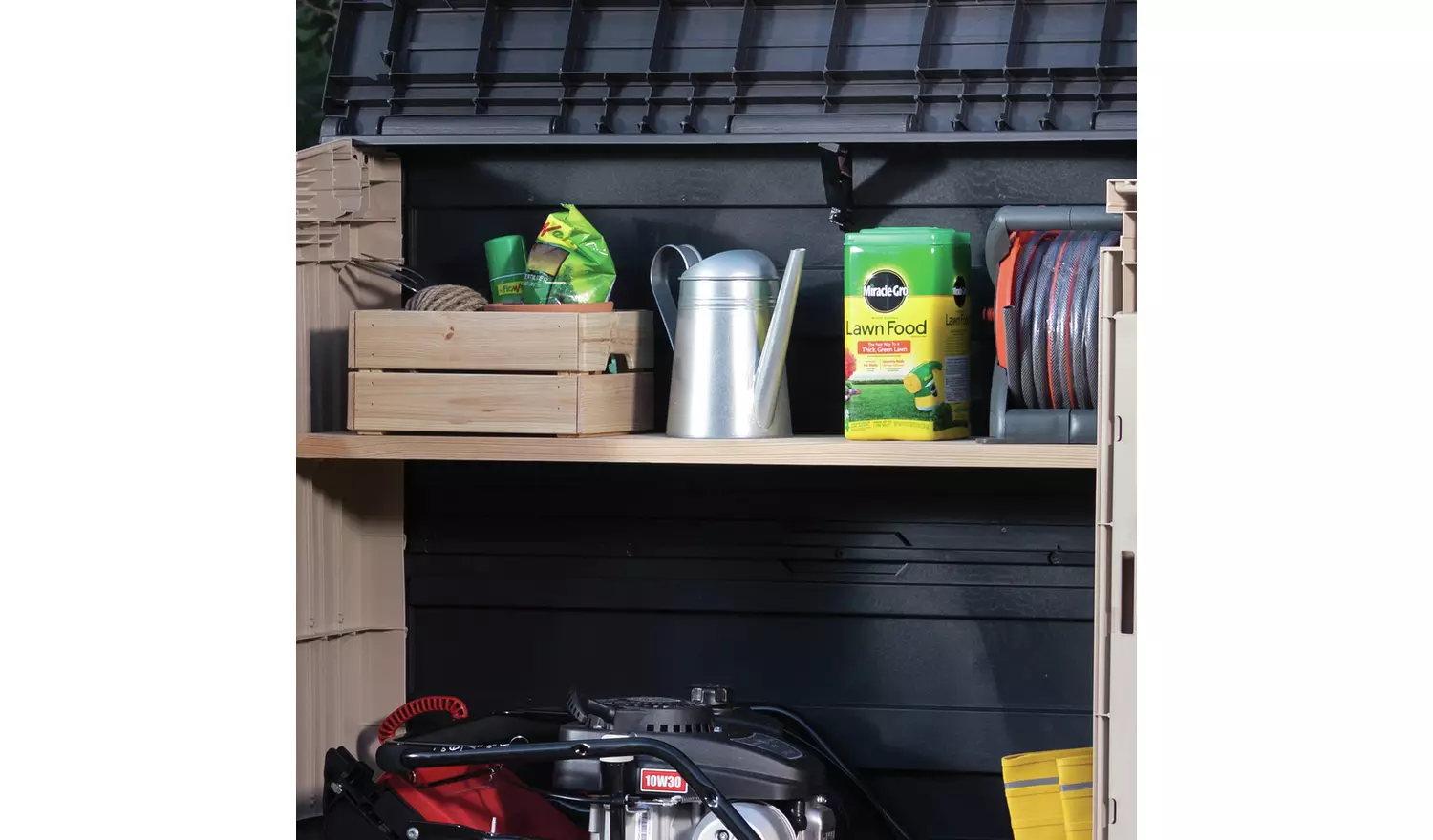 - Ideal outdoor storage solution for garden tools and equipment, BBQ and accessories and x2 120L wheelie bins