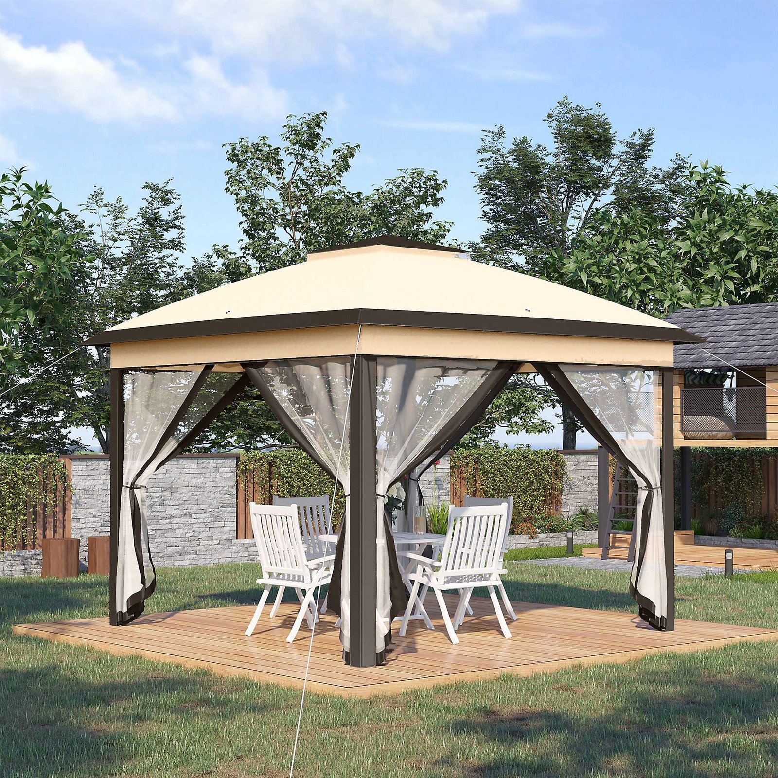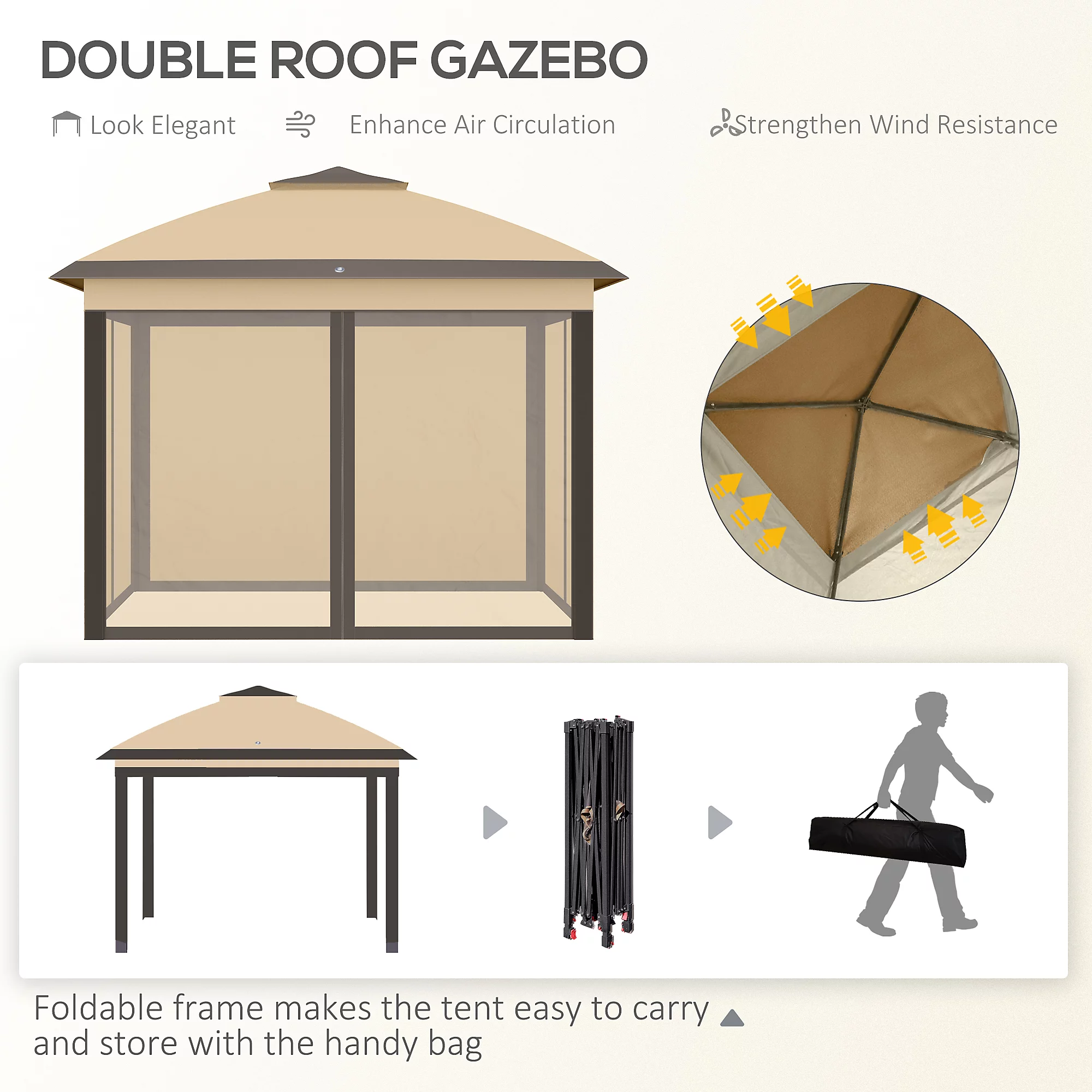 Outsunny 330cm x 330cm Pop Up Canopy, Double Roof Foldable Canopy Tent with Zippered Mesh Sidewalls, Height Adjustable, Beige