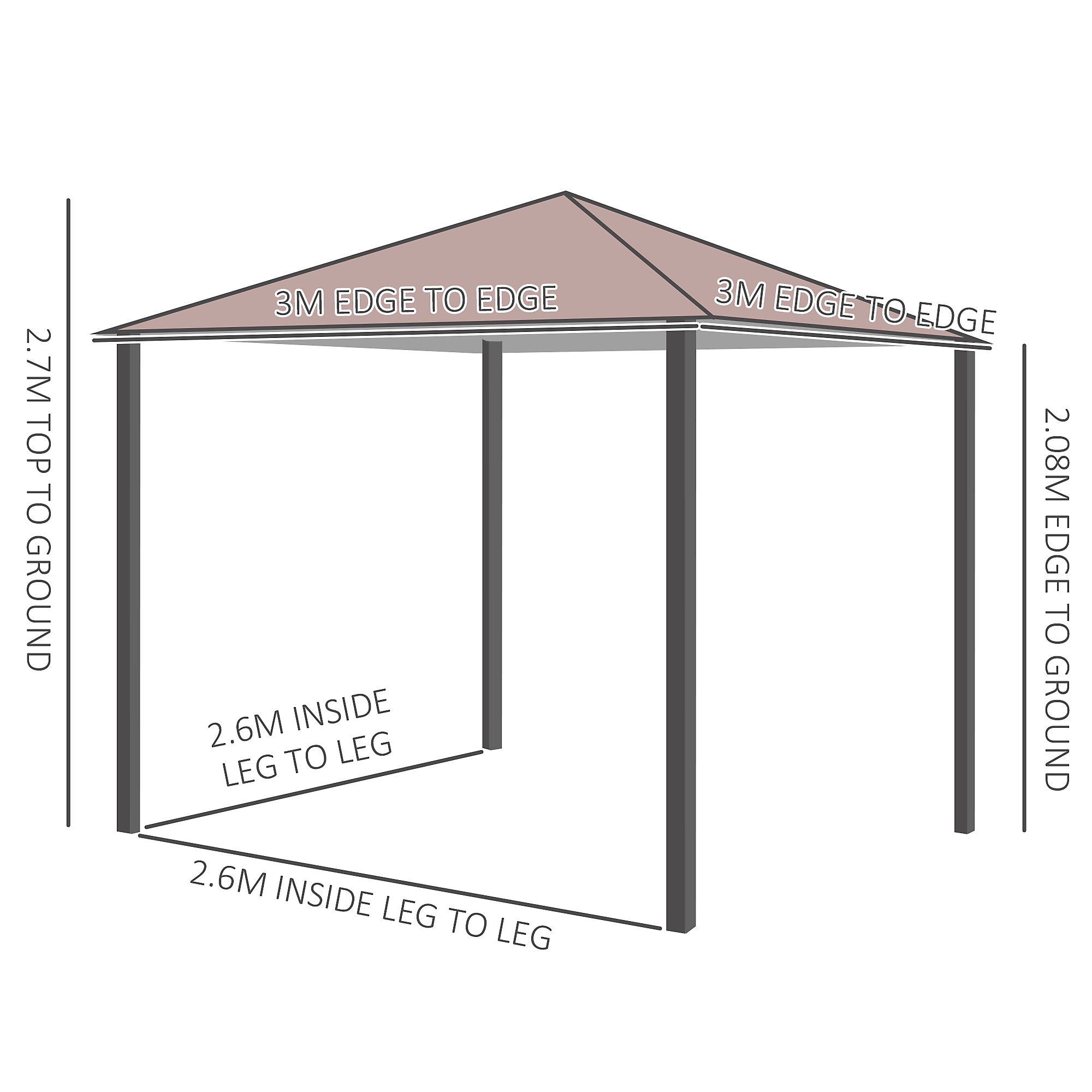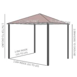 - •Brand New in Good Condition ; •Overall dimension: 300cm (L) x 300cm (W) x 270cm (H) ; •Canopy Colour: Coffee ; •Top Cover Material:180g/m2 Water-Proof PA coated Polyester Canopy. ; •Side walls: 160g/m2 polyester fabric ; •Frame: black powder coated steel ; •Custom label: 01-0873